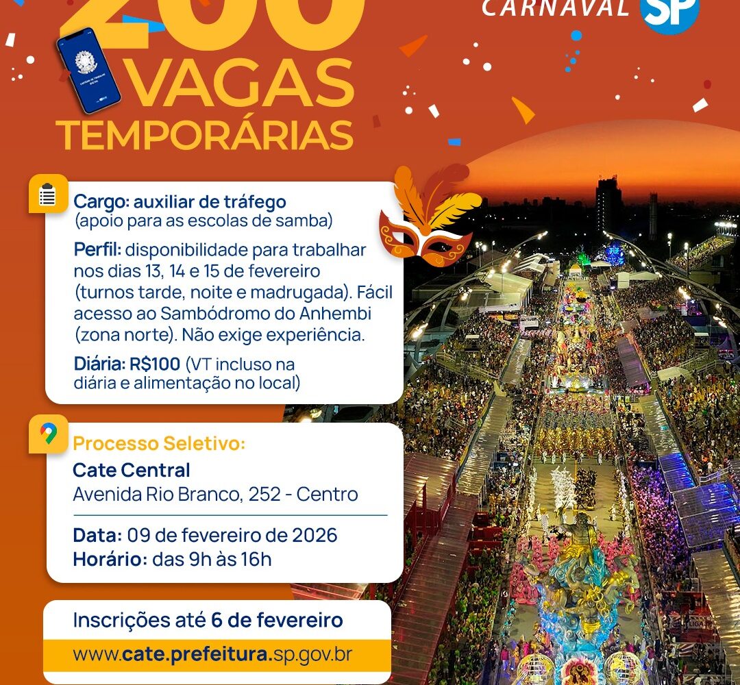 Leia MaisA Prefeitura de São Paulo inicia no dia 5 de fevereiro os processos seletivos para emprego temporário no Carnaval da cidade. São mais de duzentas vaga