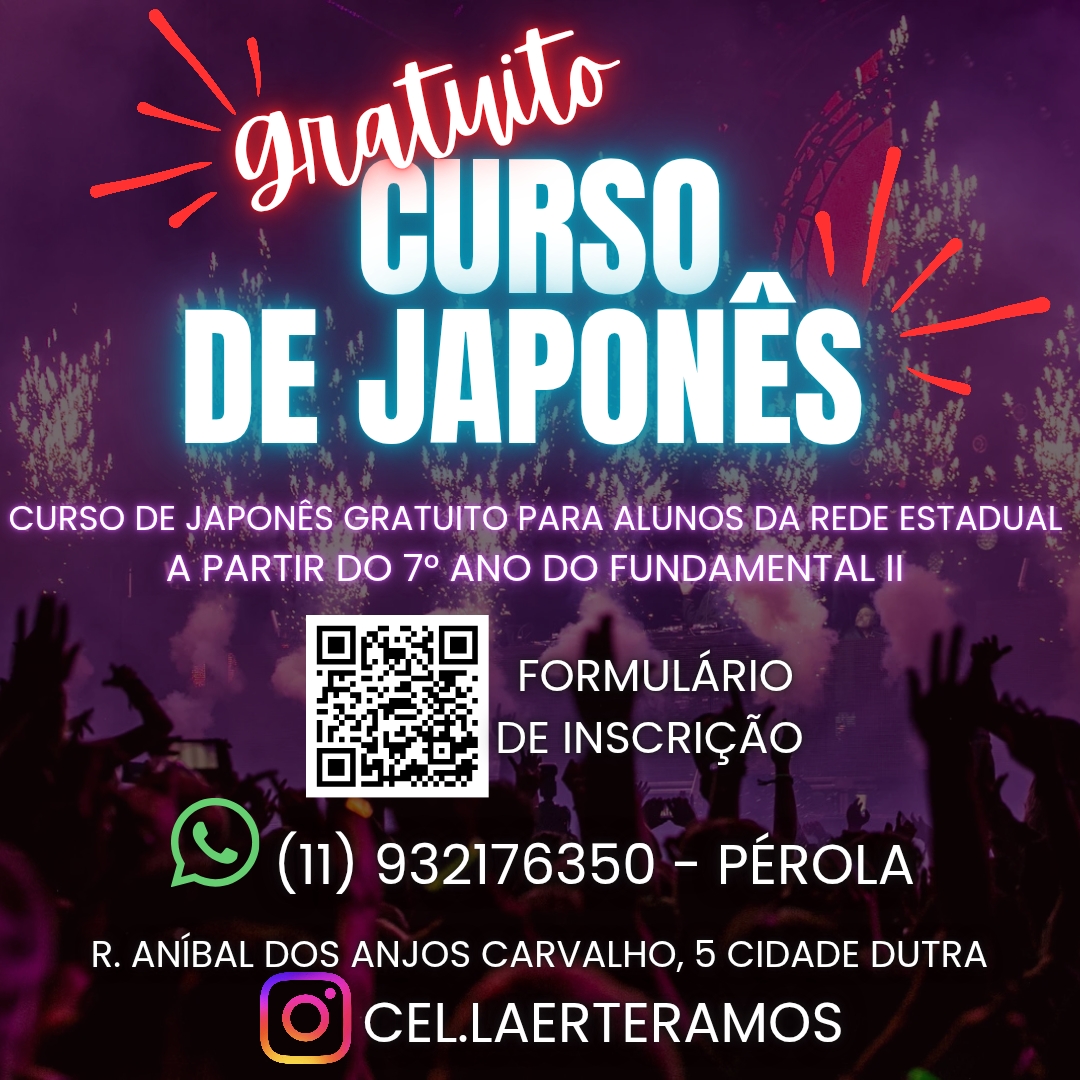 O professor Diego Horta convida alunos a partir do 7º ano do Fundamental II da rede estadual de ensino a participarem do curso gratuito de Japonês na Escola Estadual prof. dr. Laerte Ramos, em Cidade Dutra, na Capela do Socorro.