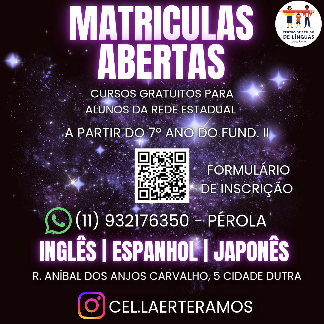 As matrículas para o curso estão abertas. Informações pelo telefone 93217-6350 (Pérola) e o endereço da E.E. Laerte Ramos é rua Aníbal dos Anjos Carvalho, 5, em Cidade Dutra.