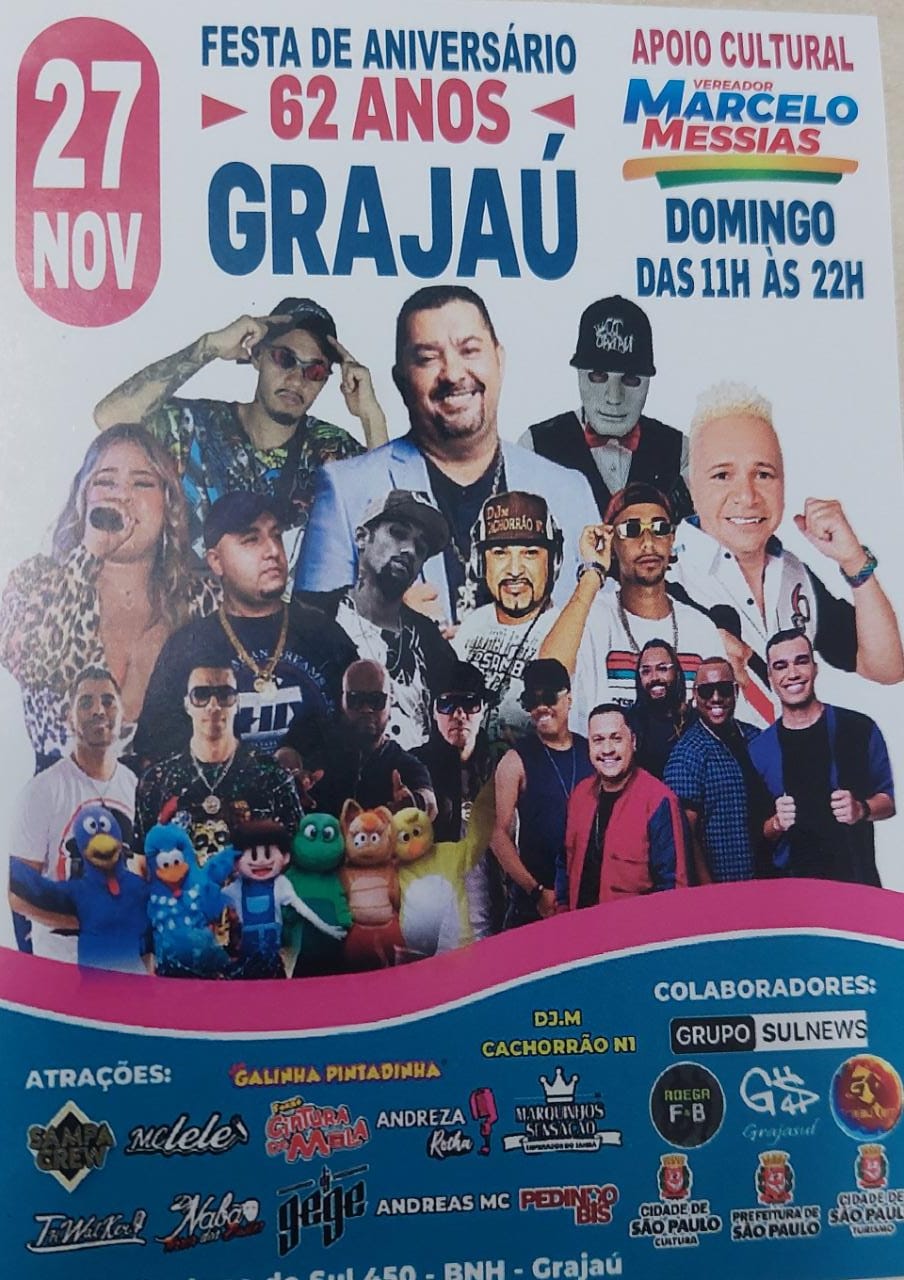 O distrito de Grajaú, no extremo Sul paulistano, completará 62 anos de existência no dia 27 de novembro, e para comemorar a data, lideranças comunitárias e políticos locais, entre eles o vereador Marcelo Messias, promoverão grande festa que contará com atrações, como o grupo “Sampa Crew”, “Cintura de Mola”, Andrezza Rocha e outras atrações mais. Também será prestada homenagem ao ativista ambiental e social, o inesquecível Ferrugem.