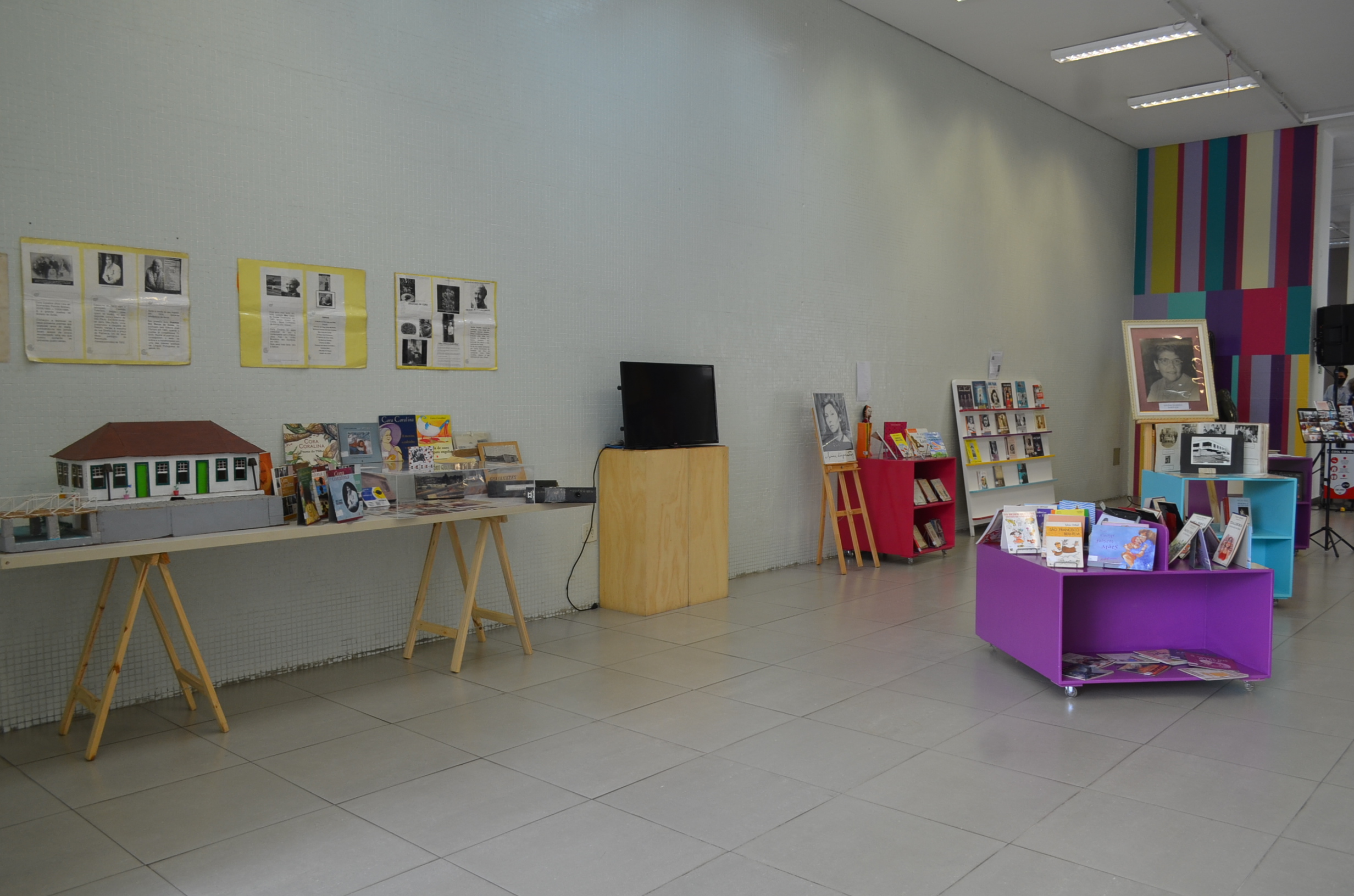 Logo na entrada do Centro Cultural, no denominado Átrio Professora Adozinda Kulhmann, os participantes do evento encontraram uma das exposições do projeto, a “Mulheres Bibliotecas”, em que puderam conhecer um pouco da historia e das curiosidades sobre as mulheres que dão nome a dez bibliotecas da cidade de São Paulo, por meio de objetos, fotos e documentários.