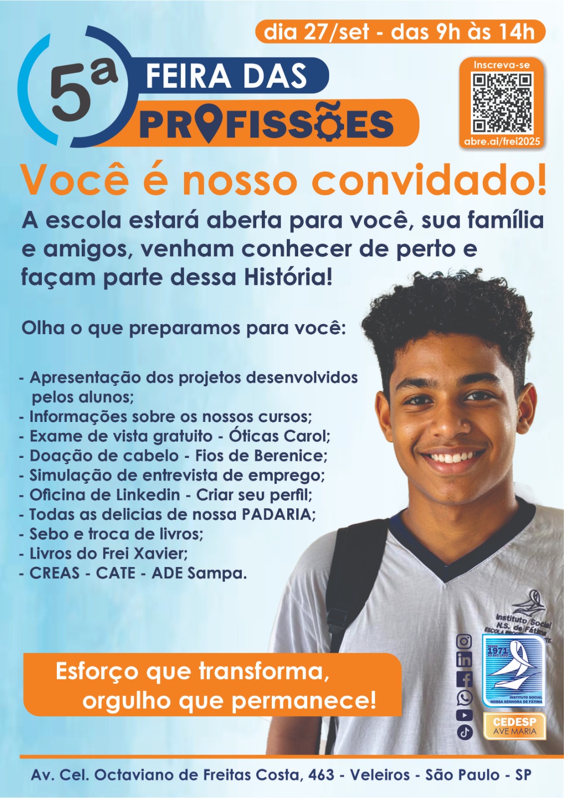 Segundo os seus organizadores, “a 5ª Feira das Profissões é mais do que um evento, é um convite para conhecer de perto o compromisso do Instituto Social Nossa Senhora de Fátima com a educação de qualidade, a transformação social e o desenvolvimento da região Sul da cidade de São Paulo”.