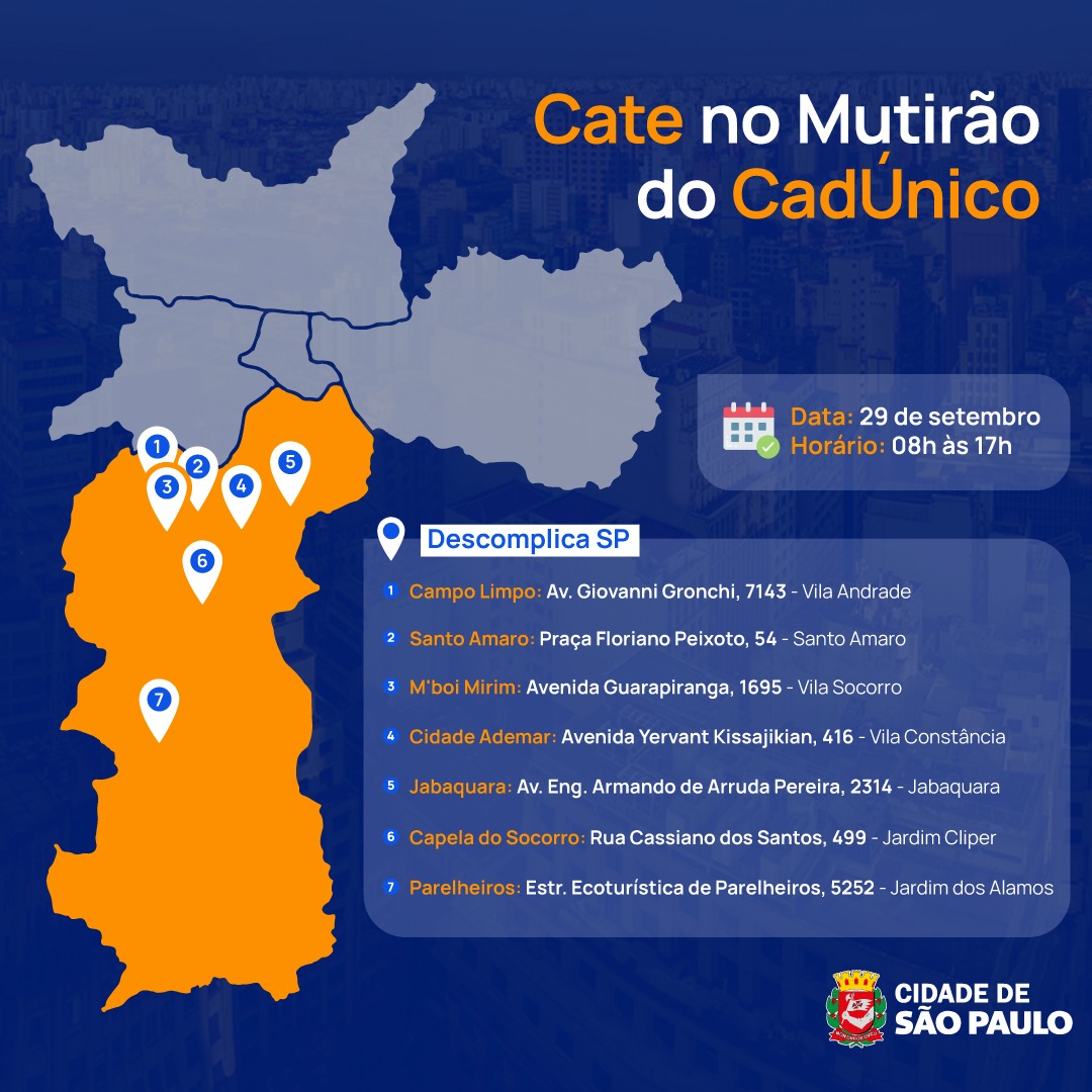 No próximo domingo, 29 de setembro, a zona Sul paulistana recebe a sétima edição do mutirão de cadastro e atualização do CadÚnico (Cadastro Único), em sete unidades do Descomplica SP: Campo Limpo, Jabaquara, Santo Amaro, Capela do Socorro, M’Boi Mirim, Parelheiros e Cidade Ademar.
