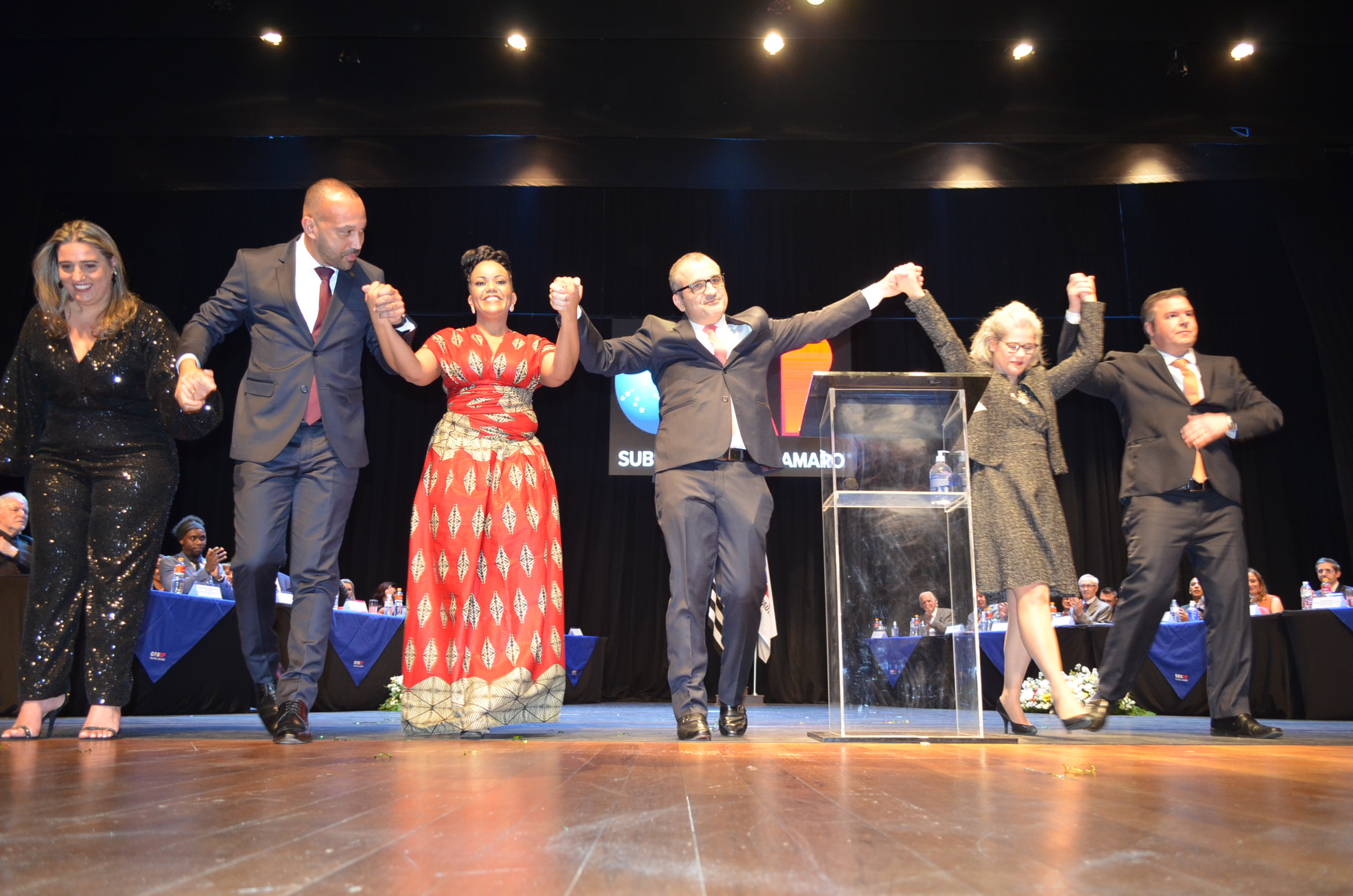 Ao seu lado estavam os novos membros da diretoria: Daniela Palhuca (vice-presidente); Gustavo Diaz Rosa (secretário geral); Viviane Scrivani (secretária geral adjunta); e Wellington Sena (diretor tesoureiro).