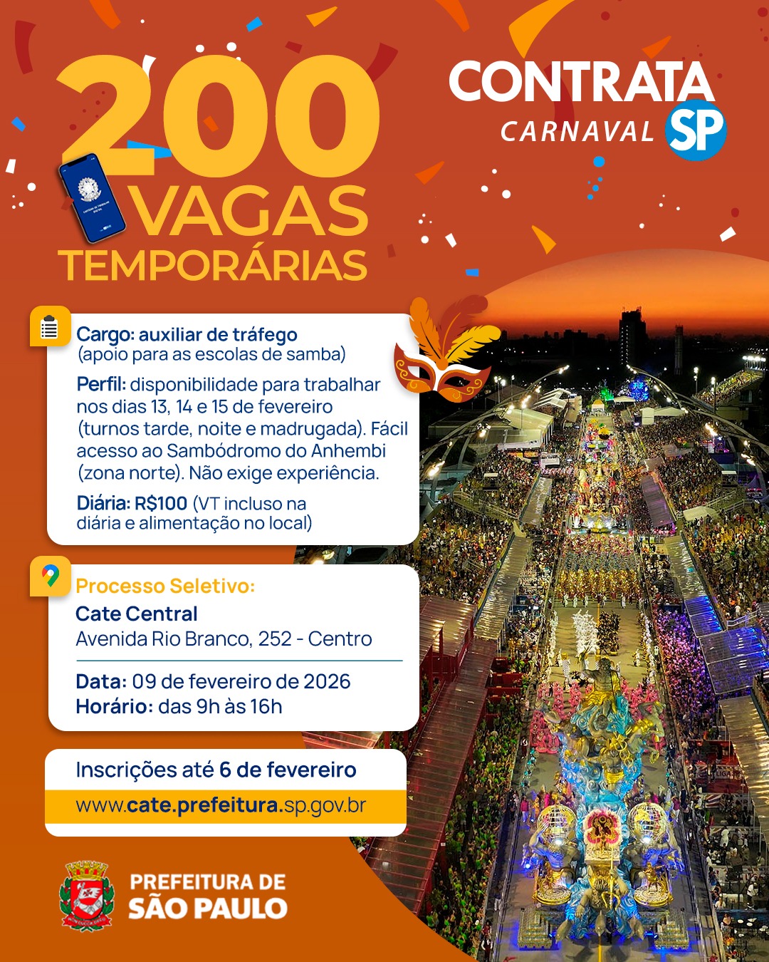 A Prefeitura de São Paulo inicia no dia 5 de fevereiro os processos seletivos para emprego temporário no Carnaval da cidade. São mais de duzentas vagas de auxiliar de tráfego, sendo a maior parte para trabalhar no Sambódromo do Anhembi. Os ganhos são por diárias que variam de R$ 100,00 a R$ 120,00, com vale transporte e alimentação no local.