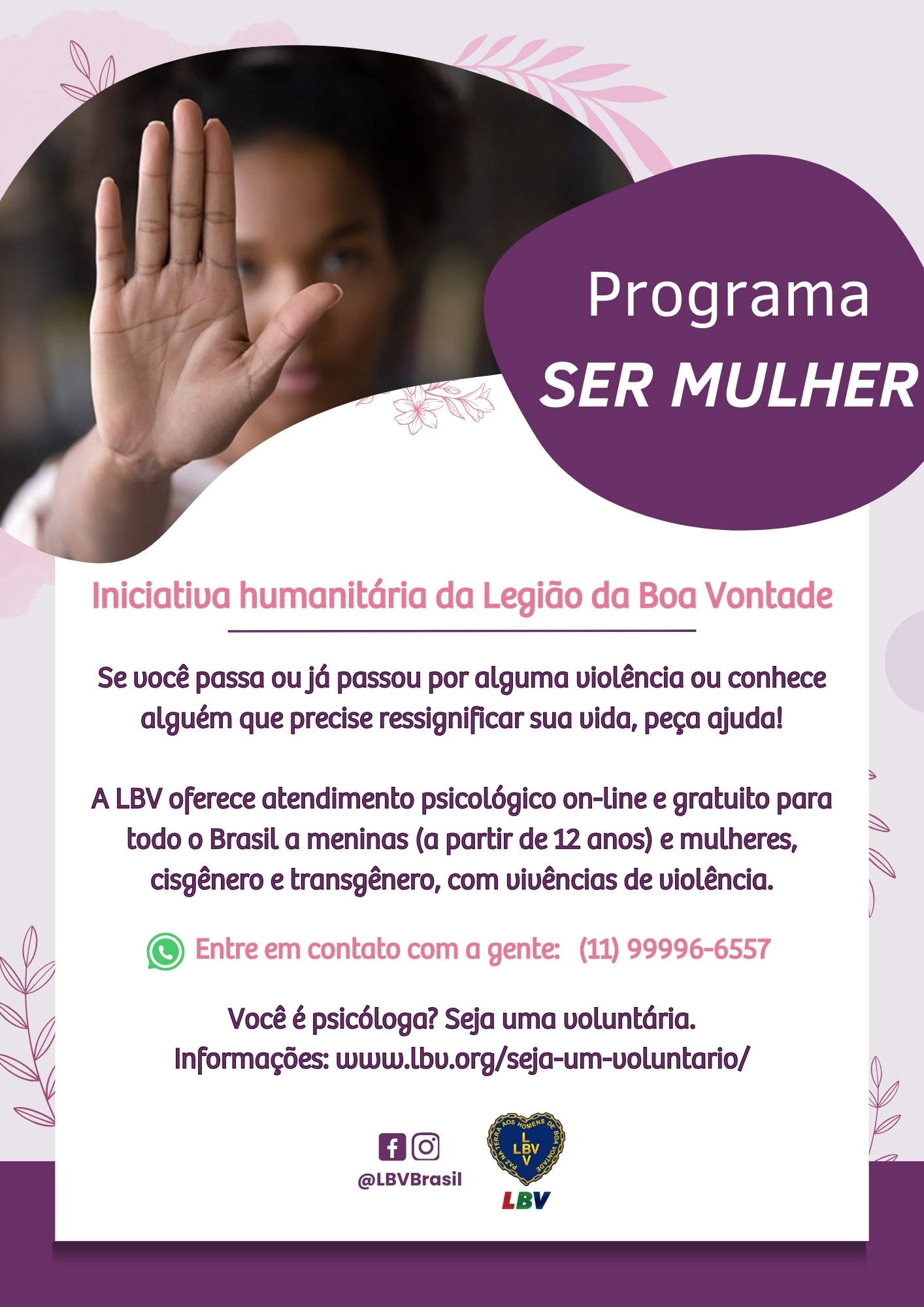 A inscrição para o programa Ser Mulher é feita pelo WhatsApp (11) 9.9996-6557. Sobre voluntariado, há chamada aberta para psicólogas interessadas pelo site www.lbv.org/seja-um-voluntario/ .