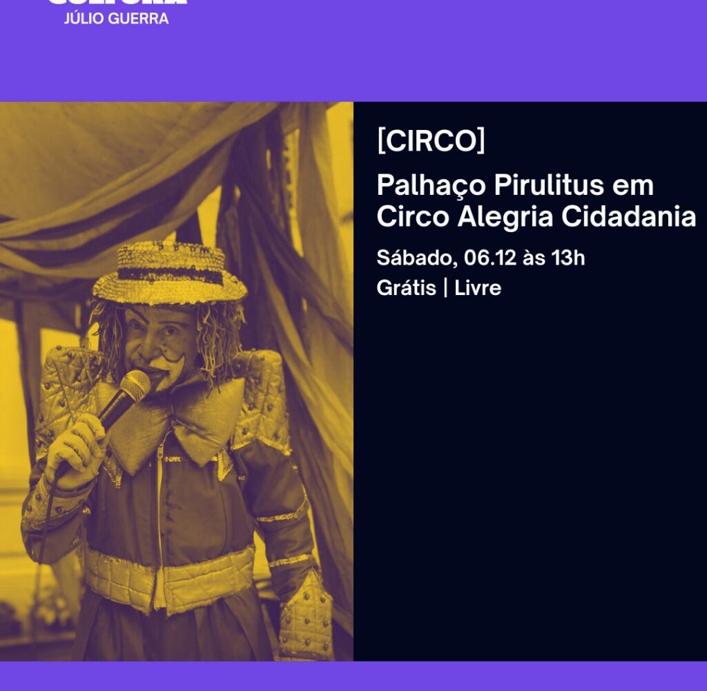 Leia MaisUma realização do Palhaço Pirulitus (interpretado por Camilo Torres), acontece no sábado, 6 de dezembro, às 13 horas, "Folias de Picadeiro" na Casa de